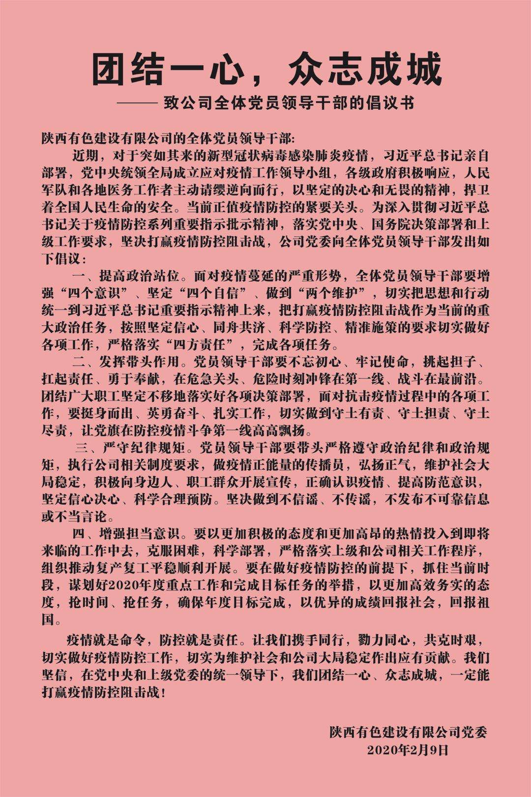疫情就是命令、防控就是責(zé)任。近日,公司黨委發(fā)布了致公司全體黨員領(lǐng)導(dǎo)干部的倡議書(shū),號(hào)召全體黨員干部切實(shí)提高政治站位,發(fā)揮帶頭作用,嚴(yán)守紀(jì)律規(guī)矩,增強(qiáng)擔(dān)當(dāng)意識(shí),為公司疫情防控工作和公司穩(wěn)定大局作出貢獻(xiàn)。