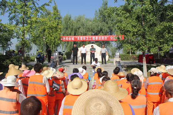 活動當(dāng)天,在鄠邑區(qū)相關(guān)領(lǐng)導(dǎo)的陪同下,陜西有色置業(yè)有限公司負責(zé)人樊躍峰帶領(lǐng)公司各部門經(jīng)理來到澇河畔的有色鉑金城運動公園,親手將一份份的降暑物品送給環(huán)衛(wèi)工人們,并向他們表達了誠摯的關(guān)懷和敬意。