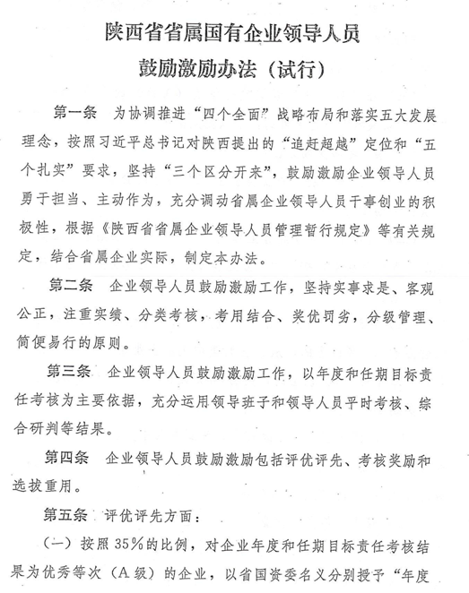 陜西省省屬國有企業(yè)領(lǐng)導(dǎo)人員鼓勵激勵、容錯糾錯、能上能下辦法