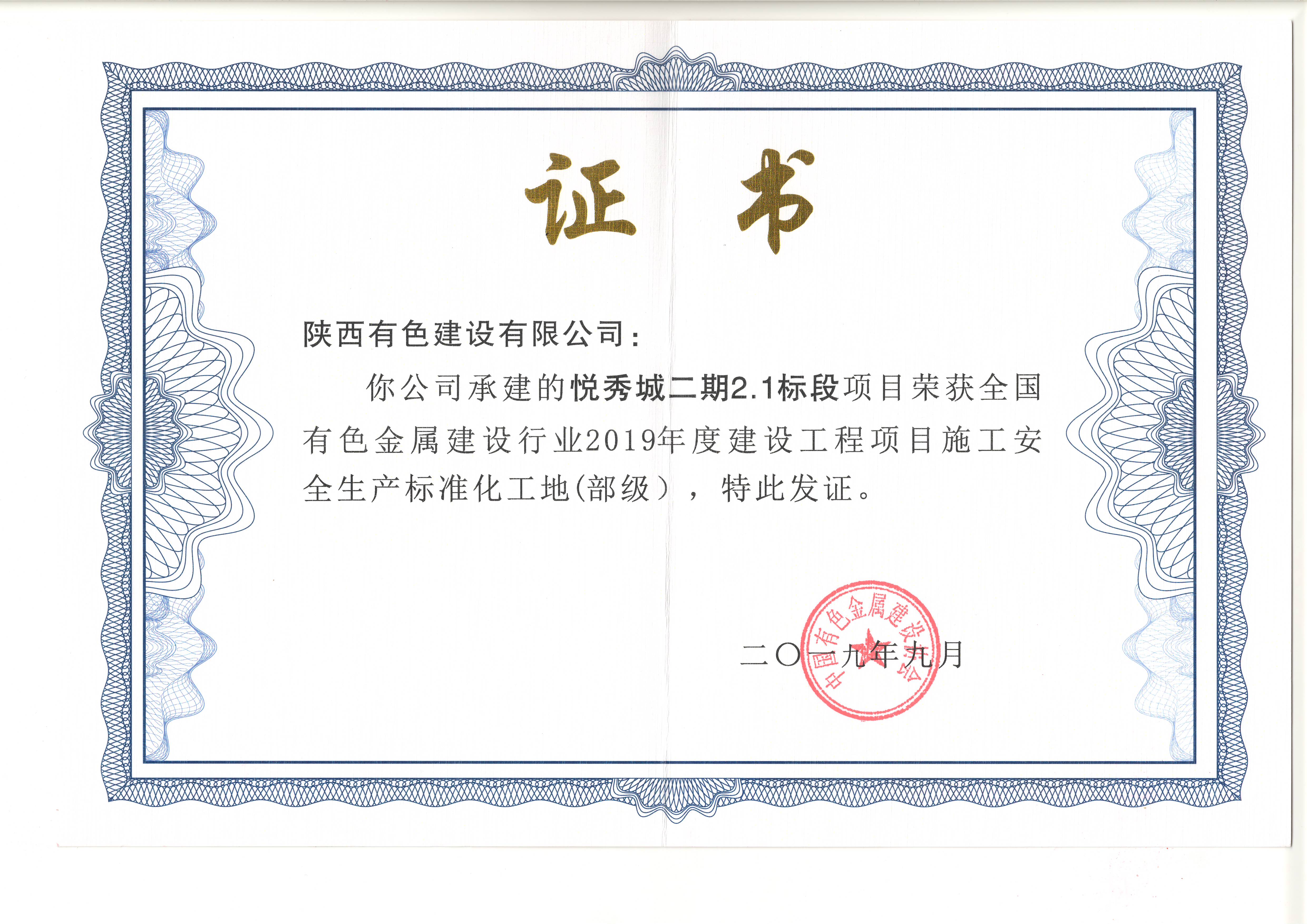 近日,從中國有色金屬建設(shè)協(xié)會傳來喜訊,公司西安鵬潤悅秀城項目榮獲“全國有色金屬建設(shè)行業(yè)2019年度建設(shè)工程項目施工安全生產(chǎn)標準化工地”稱號。