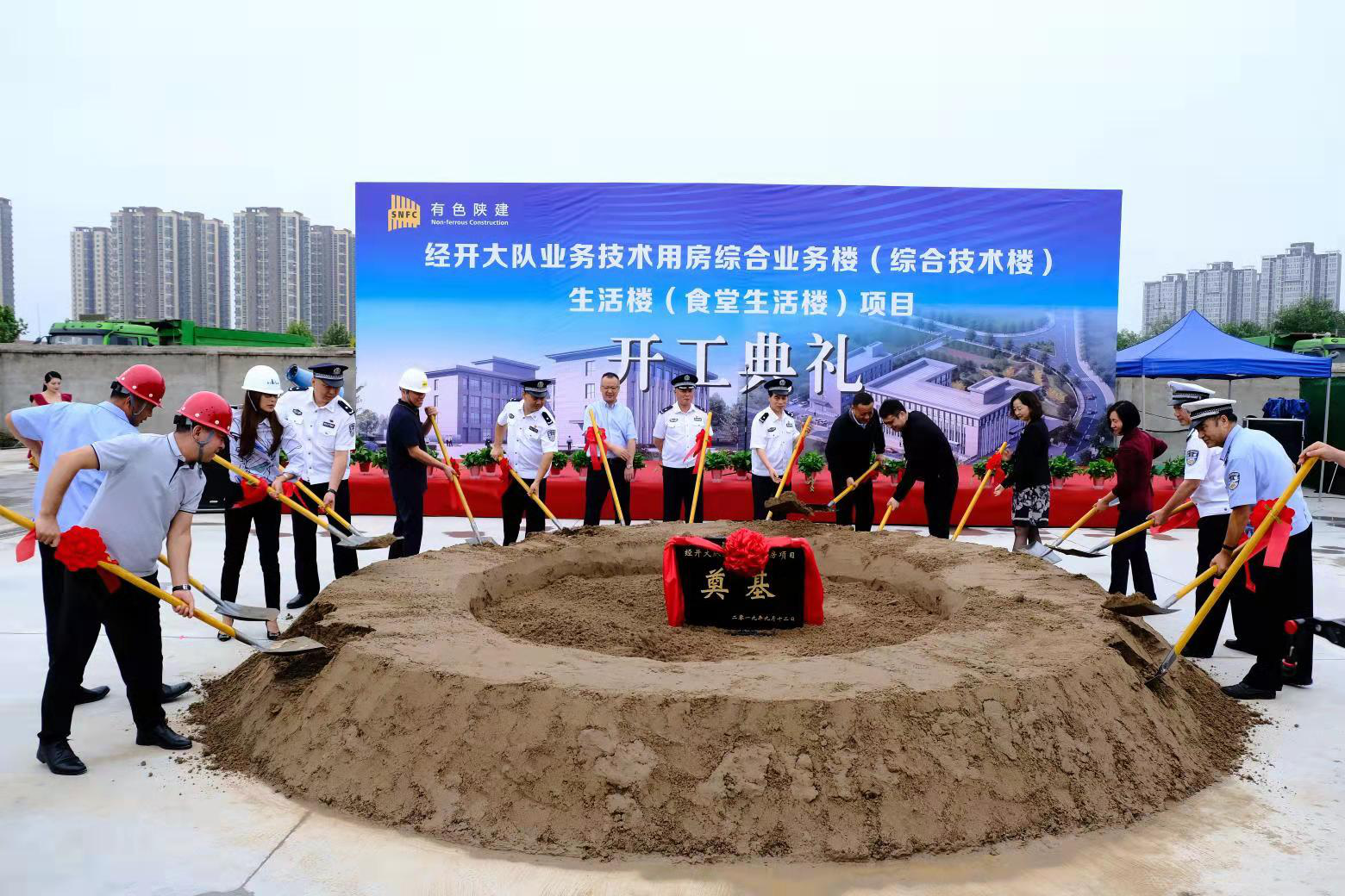 最后,西安市公安局副局長趙亞平宣布奠基儀式正式開始,大家同擎金鍬,揚(yáng)土培基。