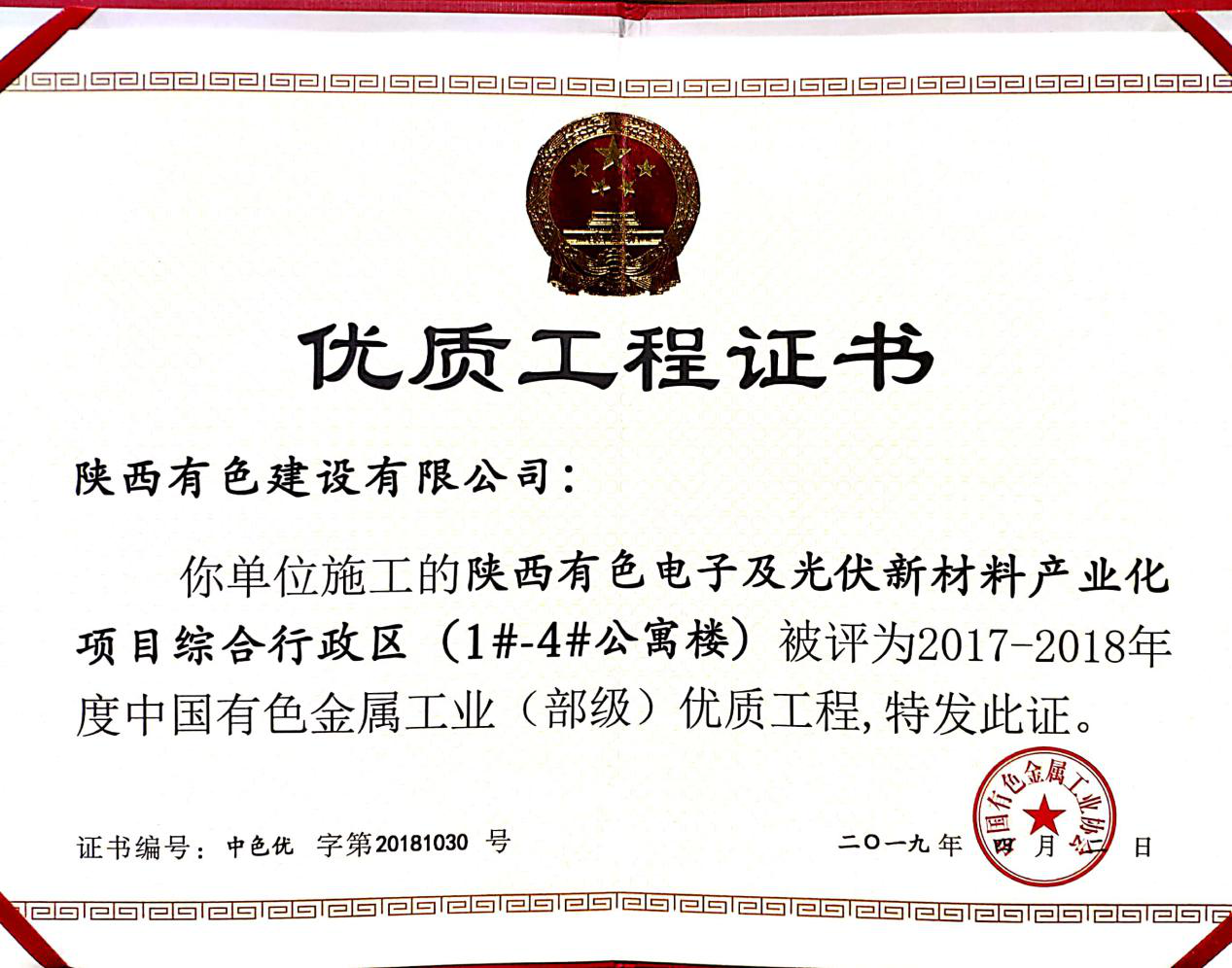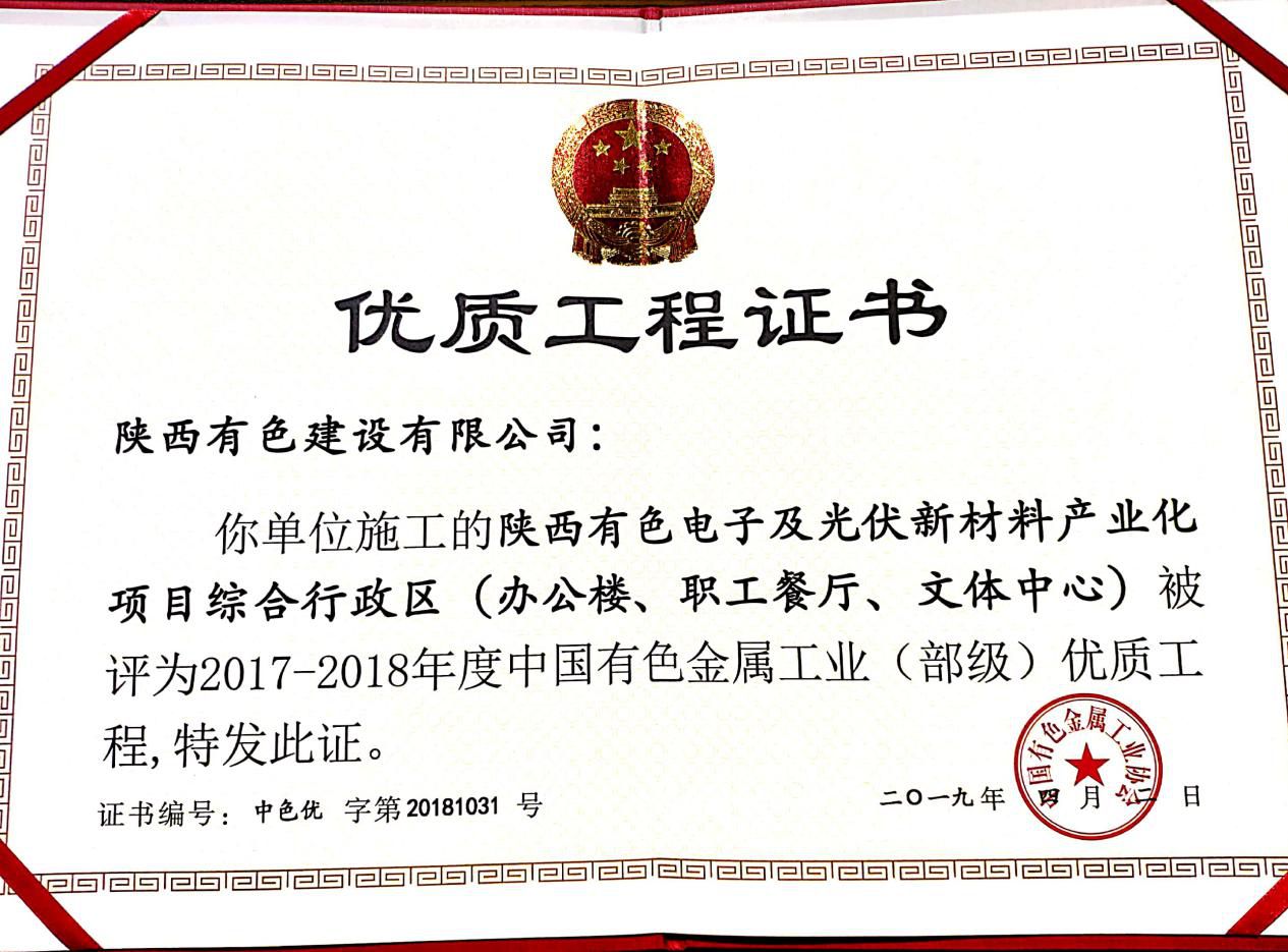 6月11日中國有色金屬工業(yè)協(xié)會召開2019年度有色金屬工業(yè)建設工程質(zhì)量監(jiān)督工作會議,表彰2017-2018年度中國有色金屬工業(yè)(部級)優(yōu)質(zhì)工程。公司承建的陜西有色電子及光伏新材料產(chǎn)業(yè)化項目綜合行政區(qū)Ⅰ標段:1#-4#公寓樓,綜合行政區(qū)Ⅱ標段:辦公樓、職工餐廳、文體中心項目被評為2017-2018年度中國有色金屬工業(yè)(部級)優(yōu)質(zhì)工程。