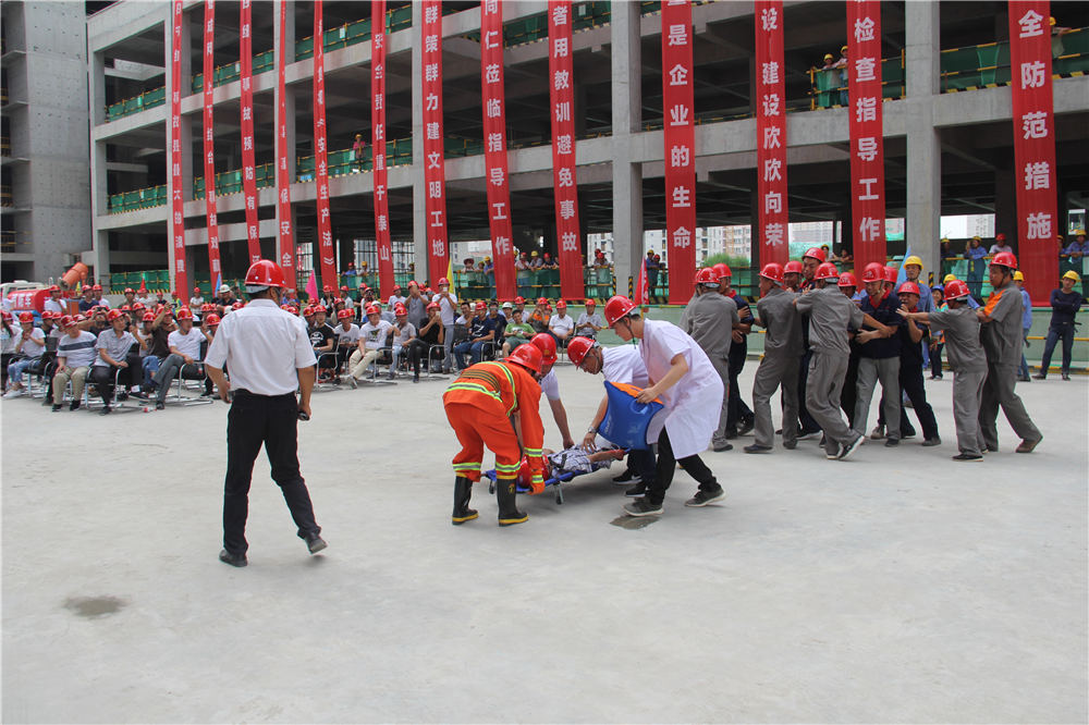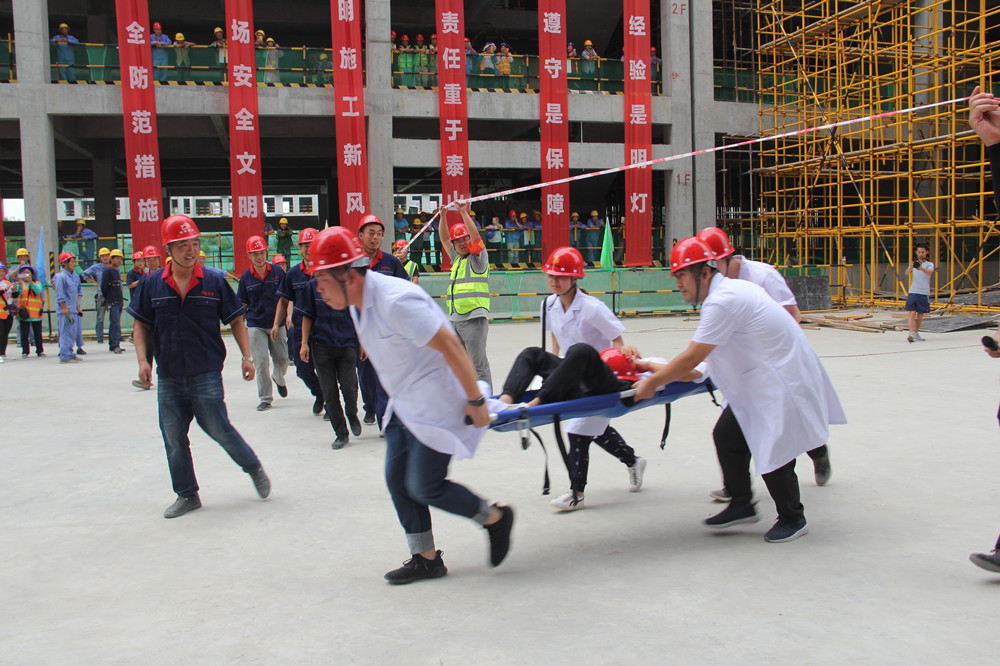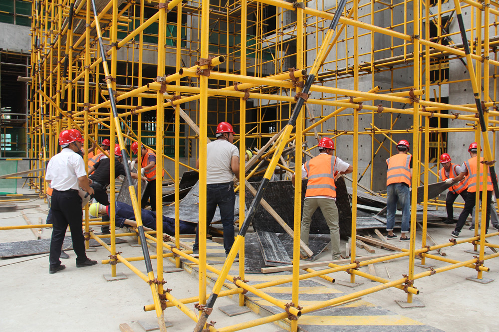 上午10:00整,隨著公司總經(jīng)理楊明鈺的一聲令下,演練正式開始。本次高支模腳手架坍塌應(yīng)急演練主要模擬:2#商業(yè)屋面支設(shè)模板時,由于工人在架體沒有加固完成及驗收合格的情況下擅自作業(yè),導(dǎo)致坍塌事故,造成1名作業(yè)人員從工作面墜落,1名架體加固工人被掩埋。事故發(fā)生后,現(xiàn)場安全員發(fā)現(xiàn)情況后立刻按照國家《生產(chǎn)安全事故報告和調(diào)查處理條例》及《安全生產(chǎn)法》的有關(guān)規(guī)定,向項目負(fù)責(zé)人進(jìn)行匯報,項目負(fù)責(zé)人立即啟動《應(yīng)急救援預(yù)案》,一邊組織應(yīng)急救援小組迅速開展自救,一邊向公司領(lǐng)導(dǎo)報告,并第一時間請求120、119等政府救援力量救援。接到險情后,公司生產(chǎn)運行部經(jīng)理張輝帶領(lǐng)公司應(yīng)急救援小組相關(guān)人員前往現(xiàn)場,指導(dǎo)救援工作。項目部應(yīng)急救援小組有序展開救援,搶險組迅速進(jìn)入現(xiàn)場清理雜物,排查危險源防止二次傷害發(fā)生;疏導(dǎo)組疏導(dǎo)事故周邊交通,指引救援車輛進(jìn)入事發(fā)現(xiàn)場;醫(yī)療組在事故現(xiàn)場對一名傷員進(jìn)行了緊急救助,并將傷者移往安全地帶,隨即趕來的119、120人員,營救了傷勢嚴(yán)重的另外一名工人;警戒組第一時間在現(xiàn)場設(shè)置了警戒線,維持現(xiàn)場秩序;調(diào)查組進(jìn)入事發(fā)現(xiàn)場對此次事故發(fā)生的原因展開調(diào)查,收集資料,模擬演練完畢。